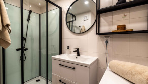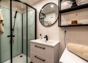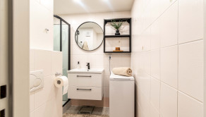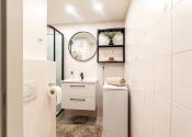 Kúpeľňa je spojená s toaletou a je v príjemných svetlých tónoch a oceníte najmä to, že disponuje sprchovacím kútom. Byt disponuje aj samostatným „walk-in“ šatníkom.