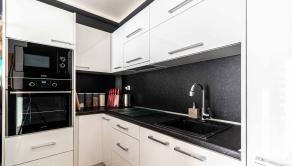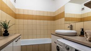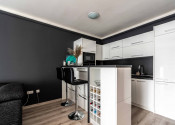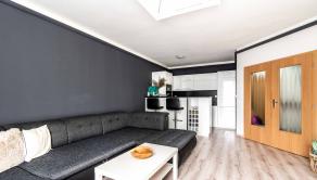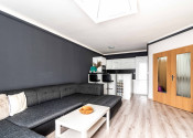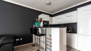 Dispozícia bytu je moderná t.z. obývacia miestnosť a kuchyňa vytvárajú tzv. „open space“ koncept. Kuchynská linka má dostatok pracovného a úložného priestoru vrátane spotrebičov a izbu opticky predeľuje praktický barový pult. Dominantou miestnosti je pohodlná sedacia súprava. Kúpeľňa je samostatná a vybavená vaňou, ktorá poskytuje dokonalý priestor na relaxáciu.