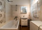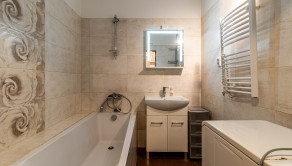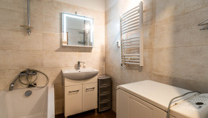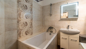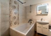 Kúpeľňa je vymurovaná s čiastočne zmenenou dispozíciou. WC je oddelené.