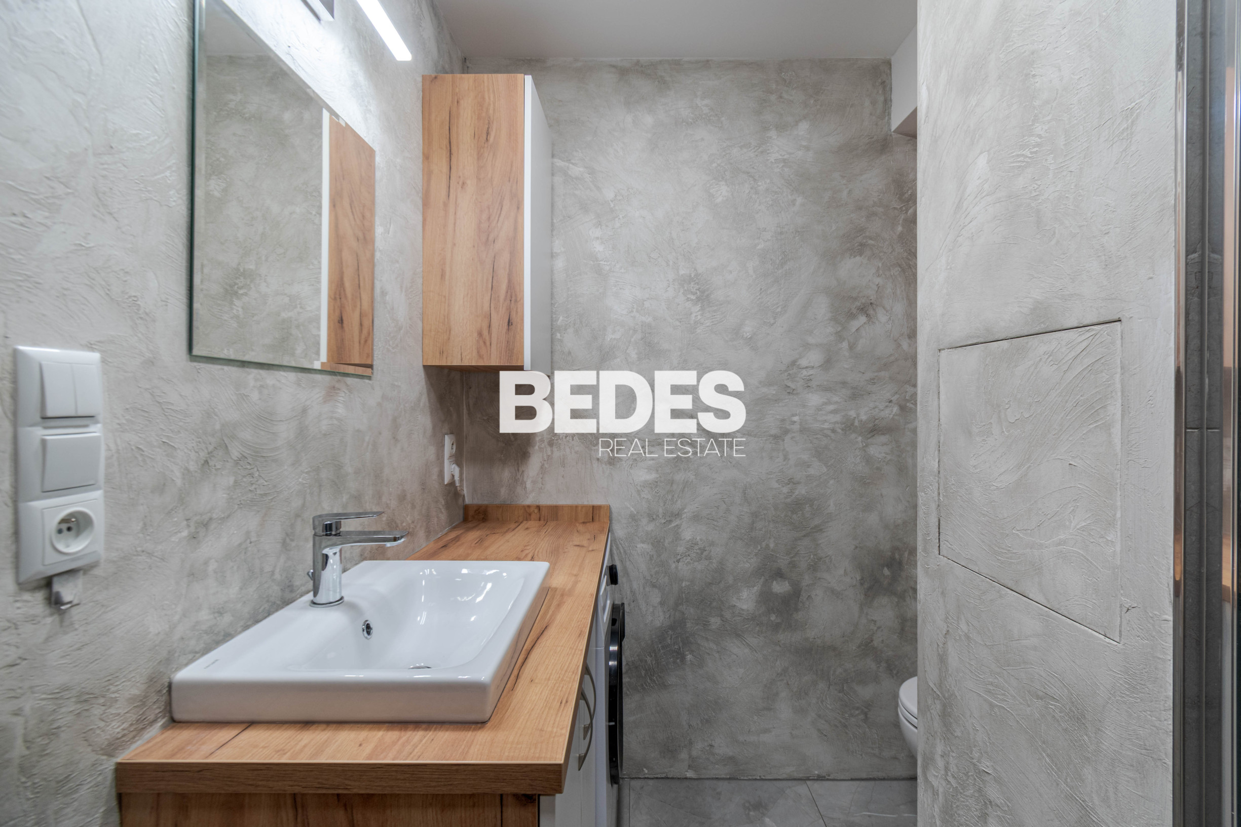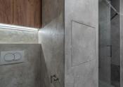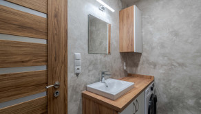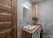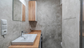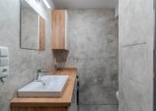 Kúpeľňa je kompletne zrekonštruovaná vrátane vodoinštalácie. Nachádza sa tu priestranný sprchovací kút a umývadlová skrinka s priestorom pre práčku. Použitý je šedý mramorovaný obklad v kombinácii s vodeodolnou dekoračnou omietkou, ktorá je pretierateľná. (v prípade, že budete chcieť zmeniť farbu)