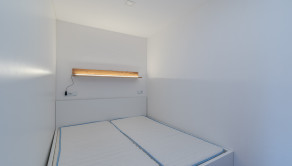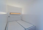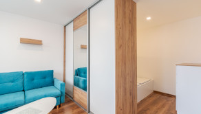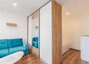 Obývacia časť je prechodná z kuchyne a ponúka dostatok priestoru na umiestnenie rohovej sedacej súpravy a ďalšieho zariadenia. Vstavaná skriňa oddeľuje časť izby, čo vytvára samostatnú miestnosť s posteľou. Posteľ má úložný priestor.