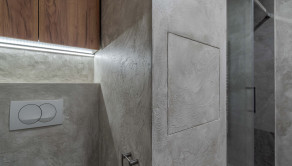 Vstupná chodba je vybavená bezpečnostnými dverami Securido a ponúka úložny priestor, ako aj miesto na sedenie a vešanie. Aj tu bola použitá dekoračná omietka, ktorá nadväzuje na celkový dizajn bytu.