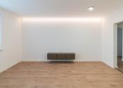 Obývacia časť je nadštandardne veľká. Stenu, kde je plánované umiestnenie TV nasvieťuje zabudované LED svetlo v strope.