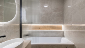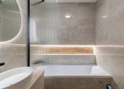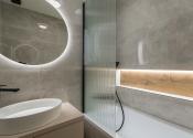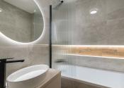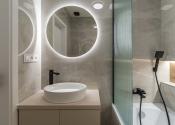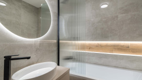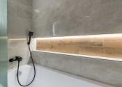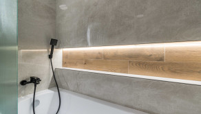 Kúpeľňa je po kompletnej rekonštrukcii vrátane vodoinštalácie. Komfortné využívanie vďaka vani so zástenou. Použité sú neutrálne farby v kombinácii s čiernými doplnkami.