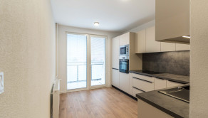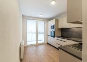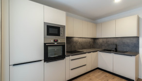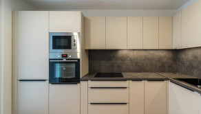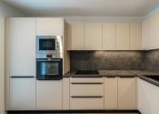 Kuchyňa je dostatočne presvetlená vďaka prechodu na loggiu, ktorý je presklený. Kuchynská linka vyrobená na mieru Vám ponúkne dostatok odkladacieho aj pracovného priestoru. Na kvalite jej pridávajú všetky vstavané spotrebiče značky Mora.