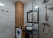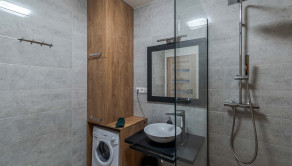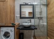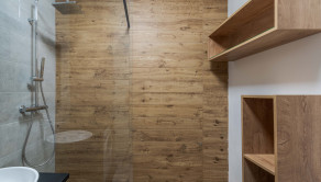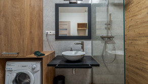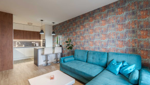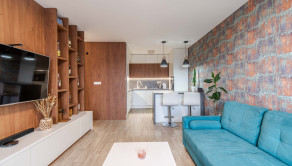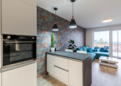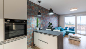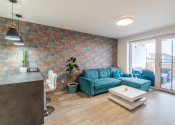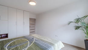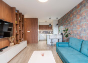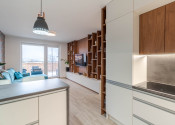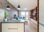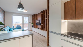 Dispozícia bytu prirodzene oddeľuje dennú a nočnú časť. Denný priestor tvorí kuchyňa s ostrovčekom prepojená s obývacou izbou a výstupom na terasu. Nočnú časť predstavuje samostatná spálňa s úložným priestorom. Kúpeľňa s walk-in sprchovým kútom a oddelená toaleta.